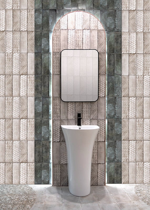 Uno de los aspectos más característicos de Armoni es su acabado mate-brillo con ligera irregularidad, que genera reflejos suaves y aporta profundidad visual a la superficie. Este efecto recuerda a los azulejos artesanales, donde cada pieza presenta pequeñas variaciones que enriquecen el conjunto y evitan la uniformidad industrial.