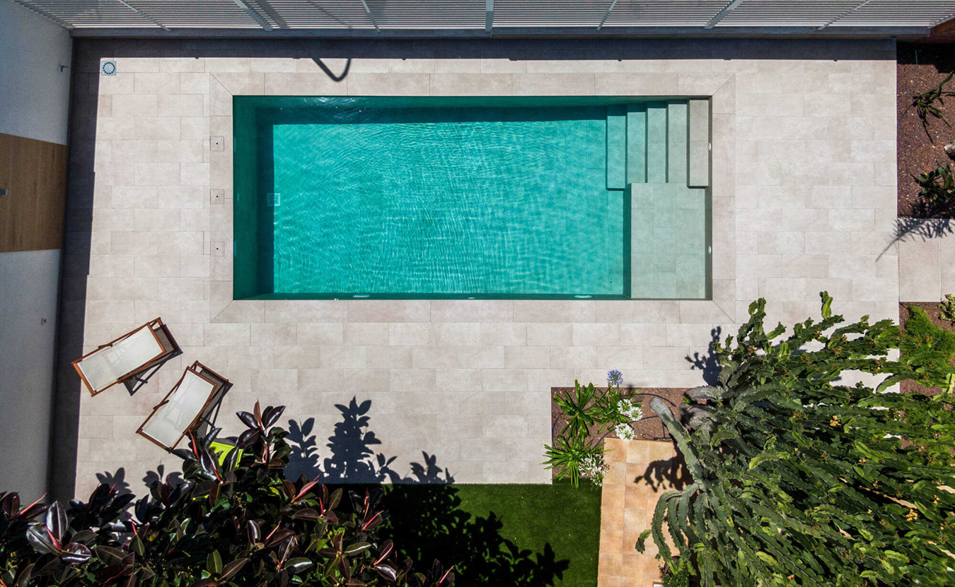 Sistema Desbordante e Infinity: Incluye la novedosa rejilla cerámica técnica que permite un drenaje perfecto manteniendo la estética uniforme de la piedra en todo el perímetro del agua.