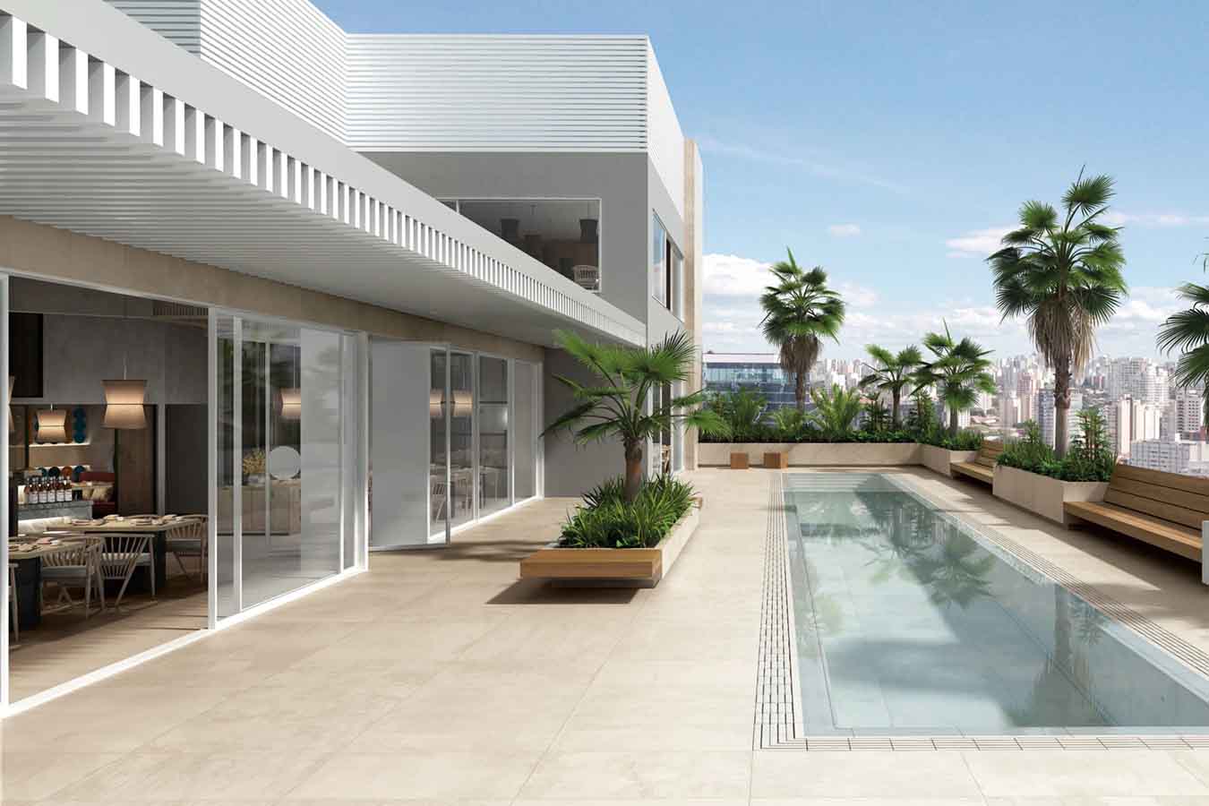 Opera no solo recubre el suelo de la terraza, sino que entra directamente en el vaso de la piscina. Exagres, como especialista en extrusión, ofrece en esta serie piezas técnicas que son imposibles de lograr con cerámica convencional: