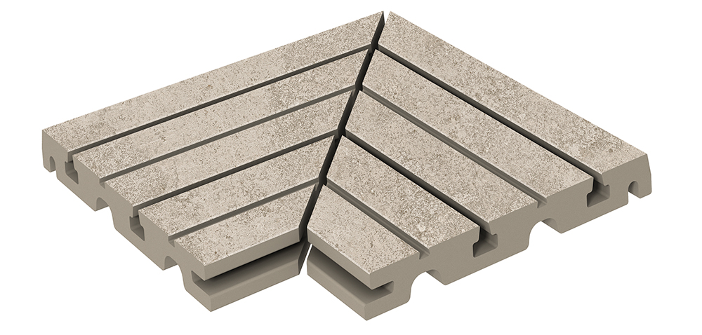 Sistemas Desbordantes: La serie incluye el borde desbordante y la rejilla cerámica técnica, permitiendo crear piscinas tipo “Infinity” donde el agua y el pavimento parecen estar al mismo nivel.