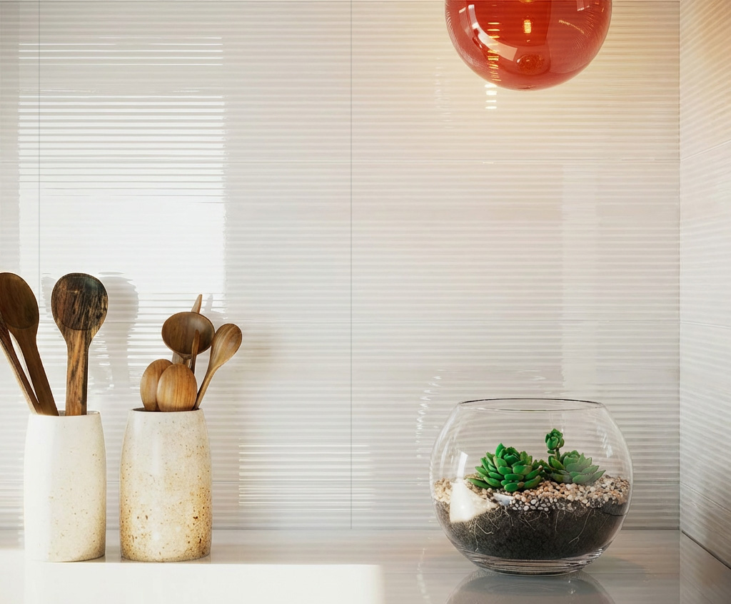 Es una colección compuesta por 4 colores en acabado brillo. El diseño de las líneas de la pieza no es un dibujo. Es el mismo relieve de la superficie el que provoca acumulaciones de esmalte en forma de rayas.